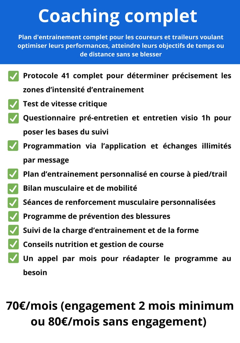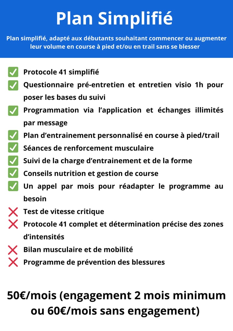 Cette offre est faite pour les coureurs et traileurs qui cherchent à améliorer leurs performances, optimiser leur entrainement et atteindre un objectif sur une course que ce soit être Finisher sur une distance ou battre un chrono. C'est un suivi complet permettant la progression durable sans se blesser. Ce suivi est basé sur des tests complets pour déterminer précisément les zones d'entrainements et les muscles à cibler pour le renforcement.