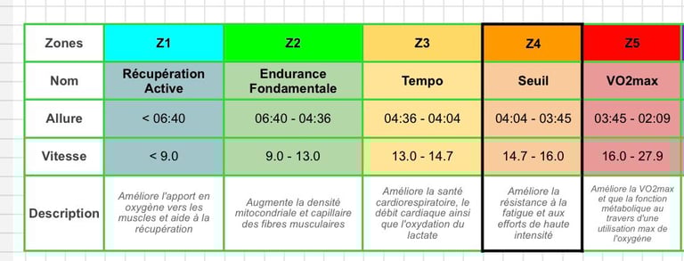 Les entrainement seront programmés sur une allure et un ressenti (et plus ou moins sur une fréquence cardiaque) pour pouvoir adapter la séance à la forme du jour